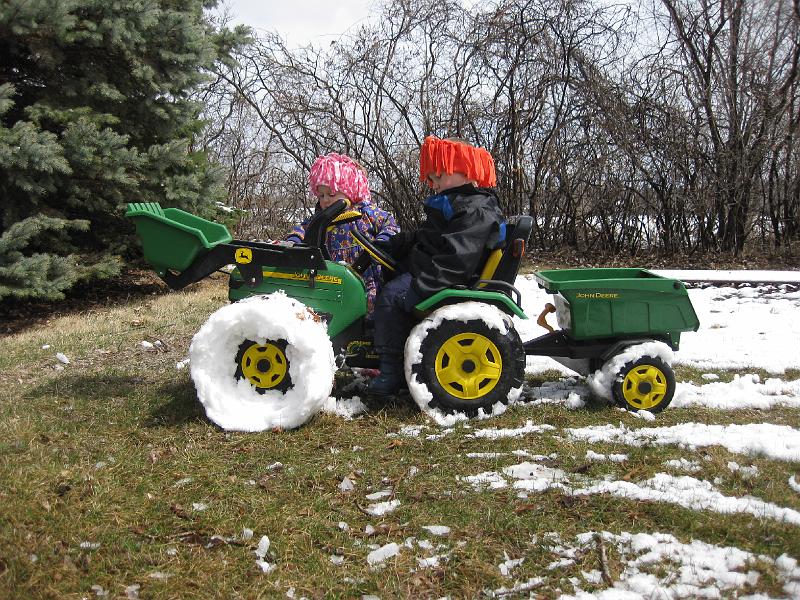 | A delightful April snow -- warm and wet and sticky, and does really cool things with tractor tires! |