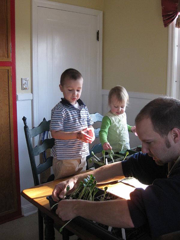 | Both kids helping Dad transplant our seedlings. |