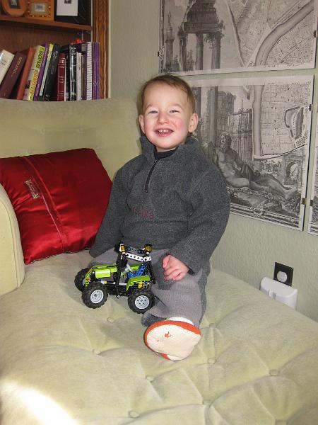 Reuben feeling pretty grown-up here. He found one of Owen's technic/lego vehicles and was pretending to drive it. He's been paying attention to Owen -- he knew to hold it by the yellow knob on the top, which he's seen Owen do because that activates the steering.