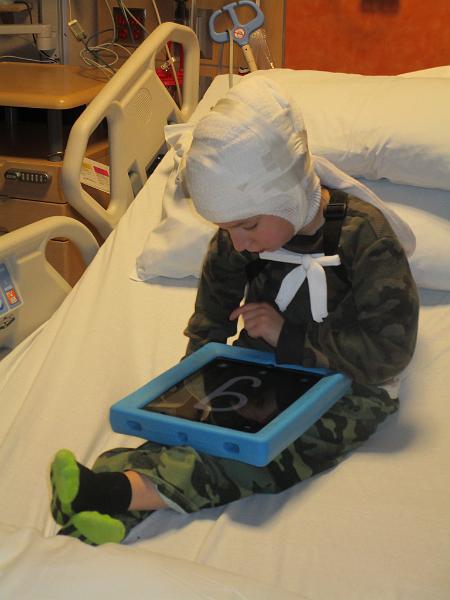But here he finally is, all wrapped up so he can't move them, and sitting comfortably in his own hospital room for the night.