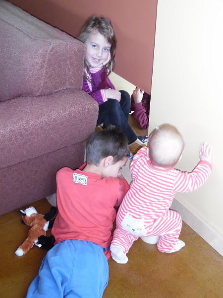 This is the reason why we still have Grandma's Christmas tree in its box in this corner instead of put away. That open window down to Daddy's office half a flight down the stairs is just two tempting for a certain oldest and youngest of ours! Until the plexi-glass goes in, this is blocked off.