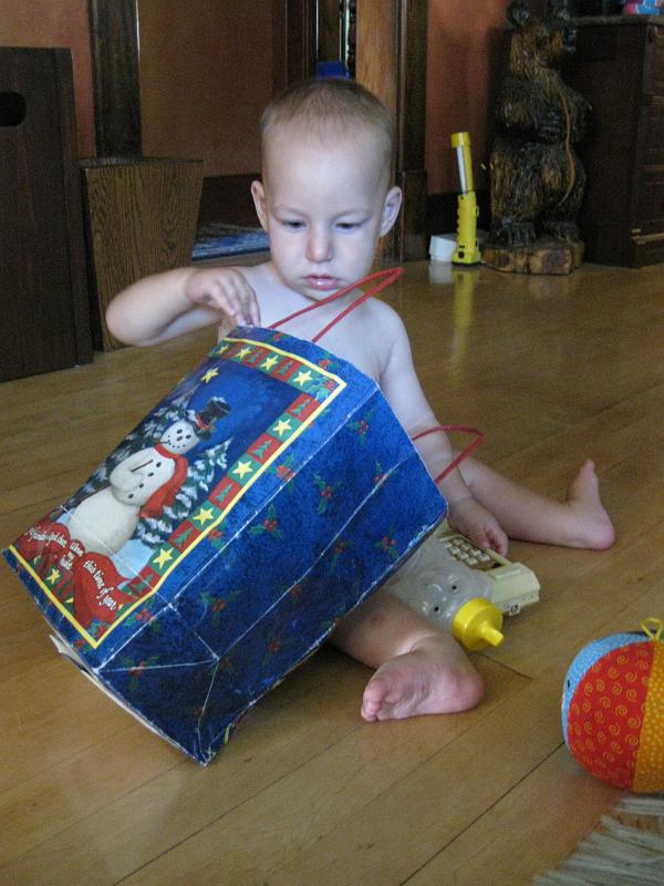| Leah packed this present for him and brought it from home. It has duplos and one of Reuben's blocks. |