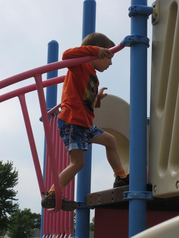 | Climbing at a park. (It was a warm day, so the fancy "face mask" from breakfast happily made its way off on its own before we went out!) |