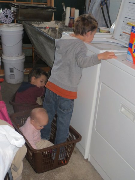 Three kids helping me with laundry. We don't usually do this because getting them all down there is a trick in itself! But some days it works out.
