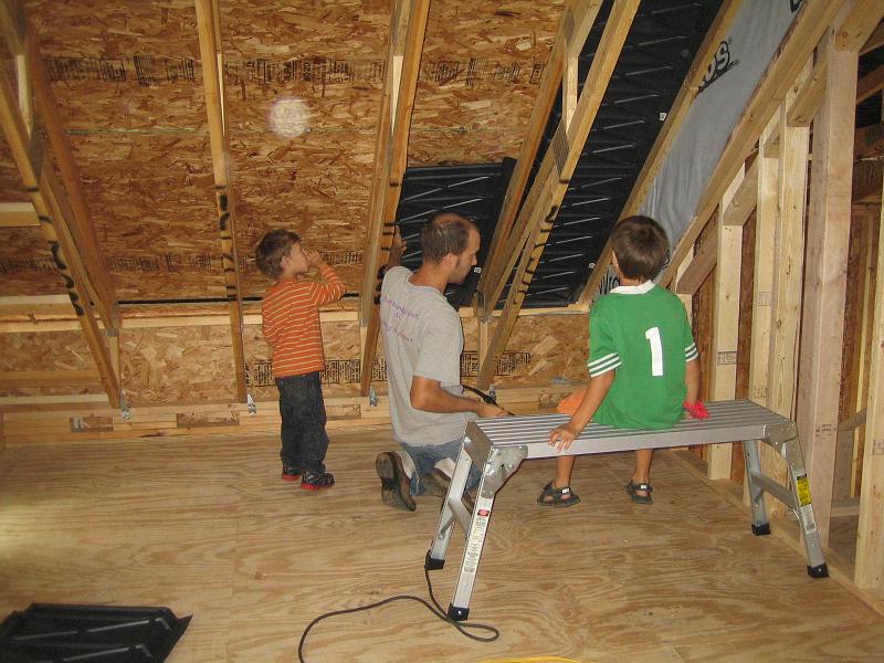 Boys helping Dad with the roof vent in the upstairs of the addition